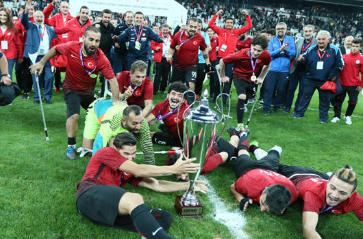 FUTBOLCUMUZ Barış Telli'nin de yer aldığı Ampute Futbol Milli Takımımız, Avrupa Futbol Şampiyonası finalinde İngiltere'yi 2-1 yenerek şampiyonluğa ulaştı. AVRUPA Ampute Futbol Şampiyonası finalinde Milli Takımımız, İngiltere'yi 2-1 yenerek şampiyon oldu. Türkiye'nin ev sahipliğinde düzenlenen Avrupa Ampute Futbol Federasyonu (EAFF) Avrupa Şampiyonası final maçında İngiltere'yi 2-1 yenen Milli Takımımız, şampiyon oldu. İzmir Büyükşehir Belediyespor formasını giyecek olan yeni transferimiz Barış Telli'ninde yer aldığı ay-yıldızlı ekip, şampiyonanın finalinde İngiltere ile Vodafone Park'ta karşılaştı. Yaklaşık 42 bin kişinin tribünden izlediği karşılaşmaya etkili başlayan Milli Takımımız, 25. dakikada Ömer Güleryüz'ün kaydettiği golle ilk yarıyı 1-0 önde tamamladı. İngiltere, 50. dakikada Westbrook'un golüne engel olamadı. Uzatma dakikalarında baskısını artıran Milli Takımımız, 50+2. dakikada Osman Çakmak'ın golüyle öne geçti ve sahadan 2-1 galip ayrıldı. Karşılaşmayı Gençlik ve Spor Bakanı Osman Aşkın Bak, Spor Genel Müdürü Mehmet Baykan, Türkiye Bedensel Engelliler Spor Federasyonu Başkanı Arif Ümit Uztürk, Beşiktaş Kulübü Başkanı Fikret Orman, Galatasaray Kulübü Başkanı Dursun Özbek ve Fatih Terim de takip etti. KUPAYI BAKAN BAK VERDİ Avrupa Ampute Futbol Federasyonu (EAFF) Avrupa Şampiyonası final maçında İngiltere'yi 2- yenerek şampiyon olan Milli Takım, kupasına kavuştu. Vodafone Park'ta oynanan ve 2-1 kazanılan karşılaşmanın bitiş düdüğüyle beraber büyük sevinç yaşayan ay-yıldızlı futbolcular, gözyaşlarına hakim olamadı. Türk bayrağıyla beraber takım halinde tribünleri dolaşan milliler, marş ve tezahüratlara eşlik etti. Milliler, madalya ve kupalarını Gençlik ve Spor Bakanı Osman Aşkın Bak'ın elinden aldı. MAÇA BÜYÜK İLGİ Türkiye'nin, İngiltere ile oynadığı karşılaşmaya seyirciler büyük ilgi gösterdi. Yaklaşık 42 bin seyirci kapasiteli Vodafone Park'ı tamamen dolduran Türk sporseverler, bayrak ve marşlarla ayyıldızlılara destek verdi.