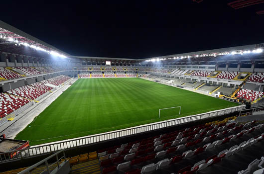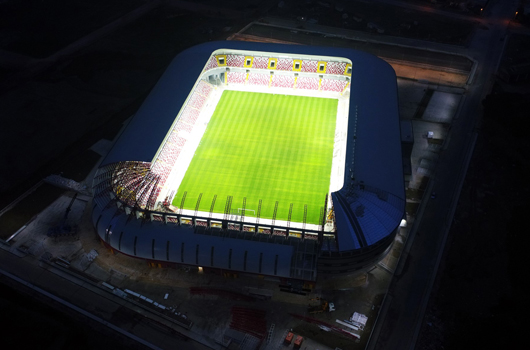 İZMİR Büyükşehir Belediyesi ve Tire Belediyesi'nin işbirliğiyle UEFA standartlarında inşa edilen 15 bin kişilik Tire Stadı gece görüntüsüyle de sporseverleri heyecanlandırıyor.IŞIK ve ses sistemlerinin kurulmasıyla birlikte yapımı büyük ölçüde tamamlanan Tire Stadı, gökyüzünden kaydedilen gece görüntüleriyle dikkat çekiyor. UEFA standartlarında inşa edilen, uluslararası karşılaşmalara da ev sahipliği yapabilecek 15 bin kişilik stat, sporseverleri şimdiden heyecanlandırıyor. 60 milyon TL'yi bulan maliyetinin yüzde 75'i Büyükşehir Belediyesi, yüzde 25'i Tire Belediyesi tarafından karşılanan kentin yeni stadında artık son rötuşlar yapılıyor. Bir yandan da İzmir Büyükşehir Belediyesi tarafından bağlantı yollarındaki imalatlar tamamlanıyor. Tribün çatısının son bölümünün de kapatılmasının ardından Tire Stadı ilk maç için hazır hale gelecek.