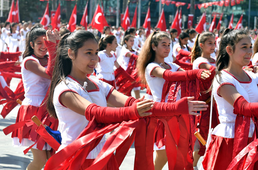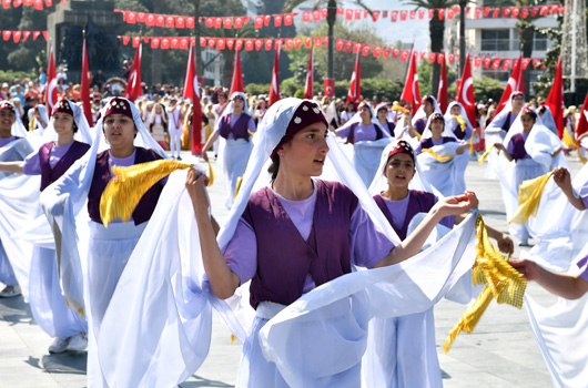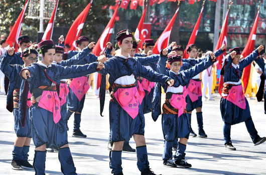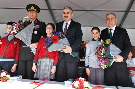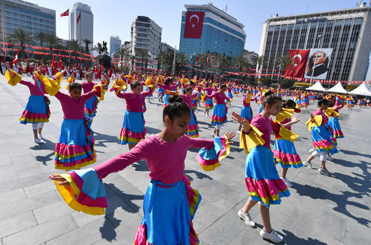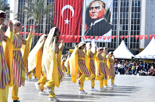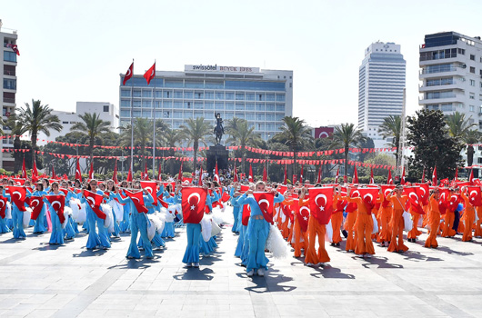İZMİR, 23 Nisan Ulusal Egemenlik ve Çocuk Bayramı'nın en coşkulu kutlandığı kentlerden biri oldu. İZMİR bu yıl da 23 Nisan Ulusal Egemenlik ve Çocuk Bayramı'nın en coşkulu kutlandığı kentlerden biri oldu. Cumhuriyet Meydanı'ndaki resmi tören, İzmir Valisi Erol Ayyıldız, Ege Ordusu Komutanı Orgeneral Abdullah Recep ve İzmir Büyükşehir Belediye Başkanı Aziz Kocaoğlu'na öğrenciler tarafından çiçekler verilmesiyle başladı. Törene çocuklarıyla birlikte katılan İzmirliler büyük ilgi gösterdi. Okunan şiirler ve yüzlerce öğrencinin büyü ;k bir uyum içinde sahnelediği dans gösterileri, kutlamalara renk kattı. Törene eşi Dr. Türkegül Kocaoğlu ile birlikte katılan Başkan Aziz Kocaoğlu, tören sonrasında İzmirlilerle bol bol hatıra fotoğrafı çektirdi.