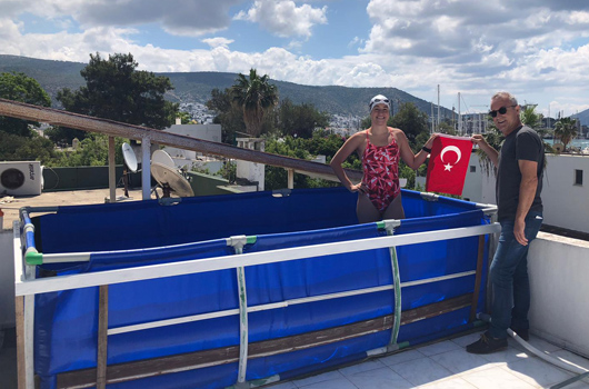 İZMİR Büyükşehir Belediyespor’un serbest stil yüzücüsü Aysu Türkoğlu, Koronavirüs salgını nedeniyle evde aylardır izole olurken antrenmanlarını ise çatıya kurduğu portatif havuzda yaptı. Tekne imalatçısı babası Mustafa Türkoğlu ile birlikte Bodrum’daki evlerinin terasına 3 m x 1,5m. ebatlarında portatif bir havuz yapan Aysu, bulduğu bu müthiş formülle antrenmanlarını bir gün bile aksatmadan yaptı. Baba Mustafa Türkoğlu da kızının tüm çalışmalarını yerinde izleyerek ona büyük destek verdi.