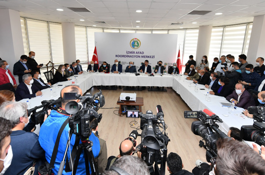 Toplantıda konuşan İzmir Büyükşehir Belediye Başkanı Tunç Soyer, bakanlara ve bakan yardımcılarına İzmir'in yanında oldukları için teşekkür etti. Bu tür felaketlerde güç birliği ve dayanışmanın önemine değinen Başkan Soyer, "İnsanların, kurumların eğer güçleri birleştirilmezse fayda yaratmaktan çok zarar veriyor. Bunların büyük bir koordinasyon içinde, uyumlu çalışması gerekiyor. Biz bu anlamda AFAD koordinasyonunda İzmir Büyükşehir Belediyesi'nin kurumsal kapasitesini seferber ediyoruz ve onlarla bu süreç boyunca uyumlu çalışmaya devam edeceğiz" diye konuştu.