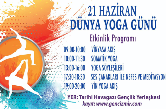 Dünya Yoga Günü etkinlikleri, Vinsaya Akış ile başlayacak. Eğitmenler Evrim Karaelmas Piyancı ve Asil Akçakaya İzmirlilerle yoga yapacak. Somatik Yoga'da eğitmen Cem Batur olacak. Günün üçüncü programında Yoga Söyleşisi yapılacak. İzmir Büyükşehir Belediyesi Sosyal Projeler Şube Müdürlüğü personeli Yoga Eğitmeni Selda Taçmahal, 10 yılı aşkın süredir yogaya ve yaşama dair tecrübelerini paylaşan Gülin Zeytunlu'yu konuk edecek. Eğitmen İrem Yeşilçavdar eşliğinde Ses Çanakları ile Nefes ve Meditasyon etkinliğinin ardından program Yin Yoga Akış ile son bulacak. Yin Yoga Akış'ta eğitmenler Dane Rusçuklu ile Bahar Selhan Şentepe yer alacak.