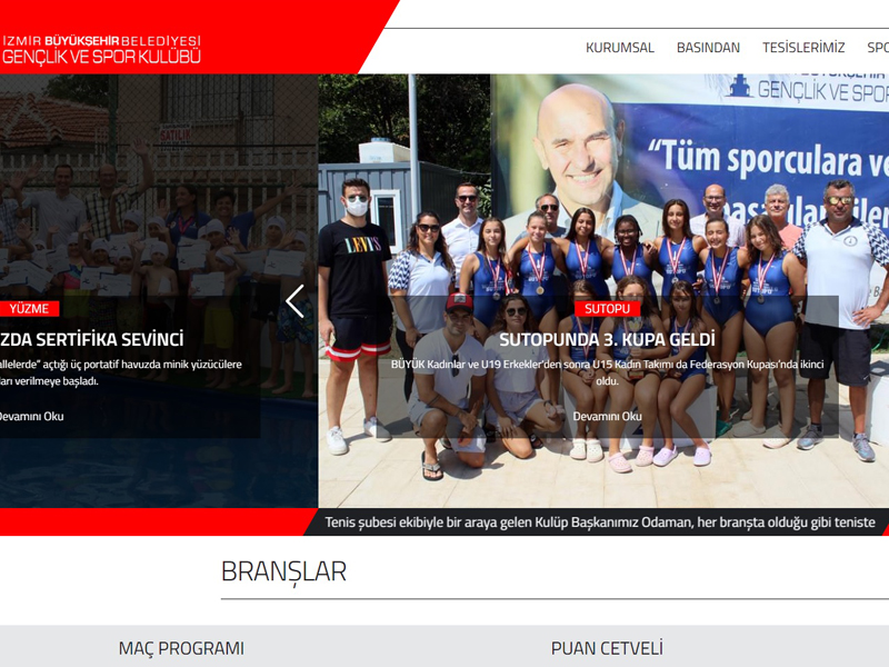 İZMİR Büyükşehir Belediyespor resmi web sitesi www.izmirbsbspor.org yenilenme yüzüyle yayına başladı. Kulübümüze ait çok detaylı bilgiler ve güncel haberlerin yer aldığı yeni sitemizde antrenör ve sporcularımız ile ilgili de özel içerikler bulunuyor. Sitede ayrıca medyada çıkan haberlerimiz, puan tabloları, maç sonuçları, maç programları, geçmiş başarılar, BİZ dergilerinin tüm sayıları, tesislerimiz ve spor okullarımıza ilişkin bilgiler yayınlanıyor.