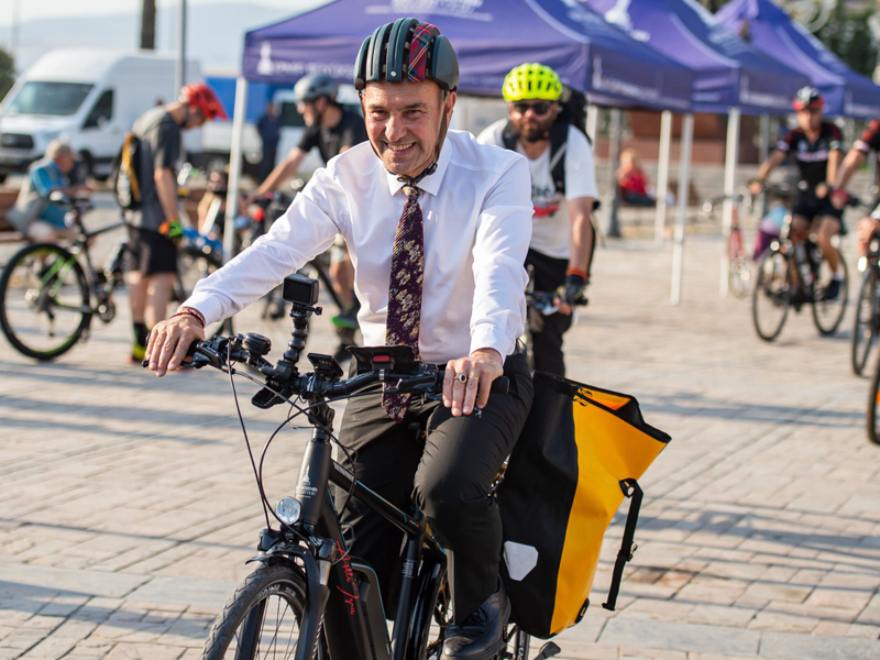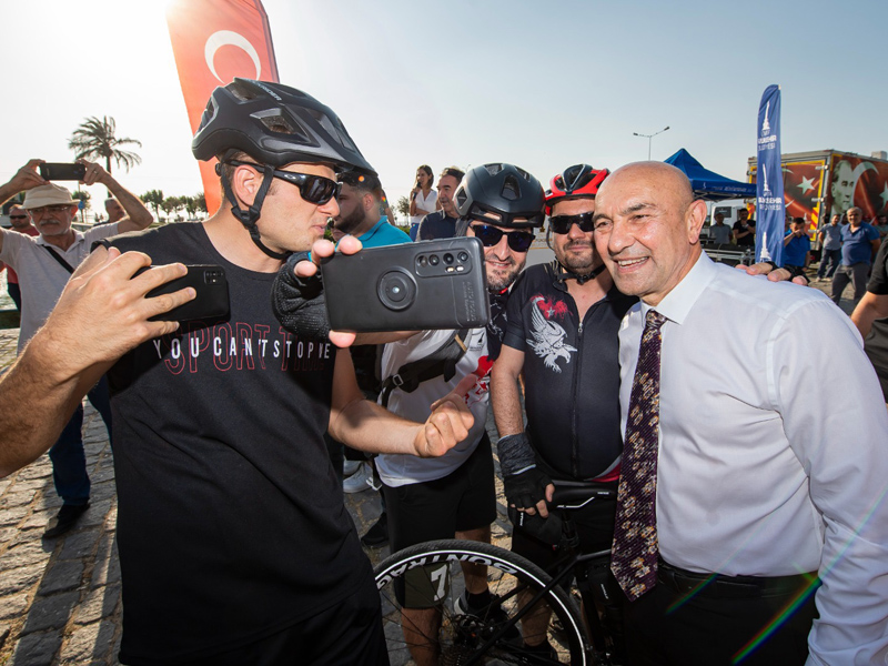 Konuşmasının ardından Başkan Tunç Soyer, İzmir Büyükşehir Belediyesi Ulaşım Dairesi Başkanı Sibel Özgür ve Bisiklet Yaya Erişimi ve Planlama Şube Müdürü Özlem Taşkın Erten ile toplu sürüşün startını verdi.
