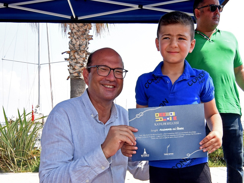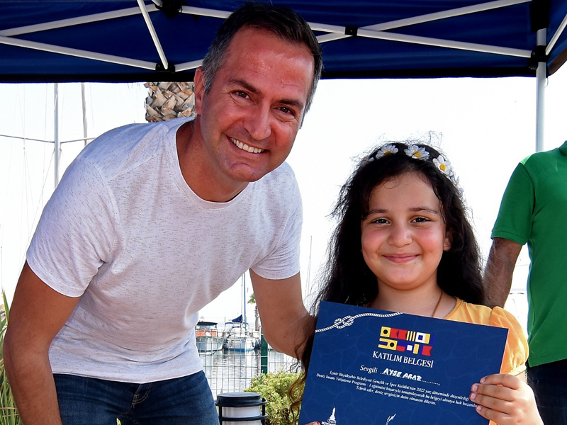 KADİFEKALELİ çocuklar hem yüzebiliyor, hem de denizi daha yakından tanıyor. İzmir Büyükşehir Belediyesi’nin Kadifekaleli çocuklar için organize ettiği “Deniz İnsanı ve Yüzme Eğitimi Projesi”nde sona gelindi. Marina İzmir’de iki aylık denizcilik ve yüzme eğitimine katılan 75 çocuk, sertifikalarını aldı. İzmir'de yüzme bilmeyen çocuk kalmasın” sloganıyla yola çıkılan eğitim programında çocuklara yüzme, optimist, gemici düğümü ve kano sürme öğretildi.