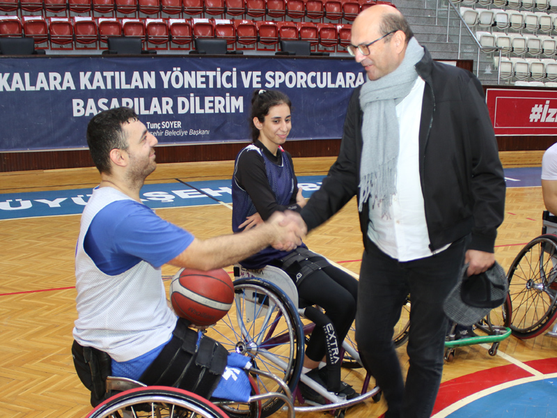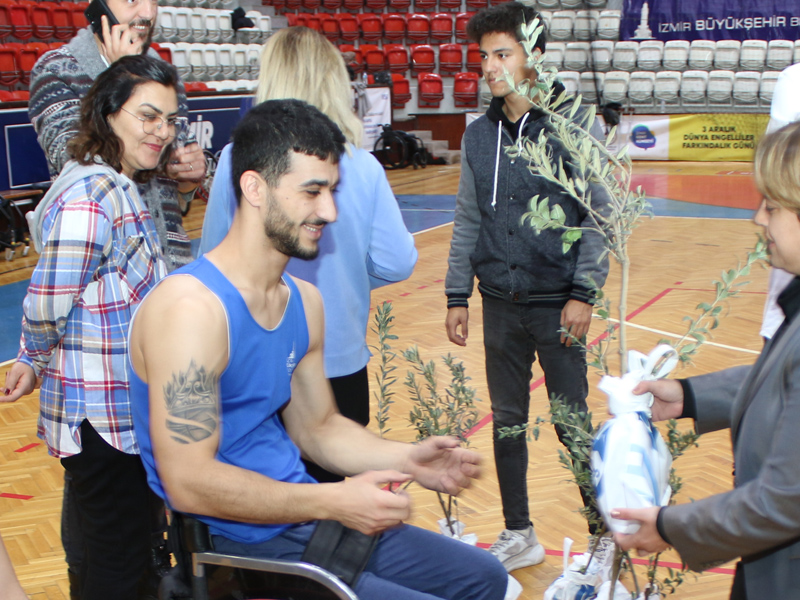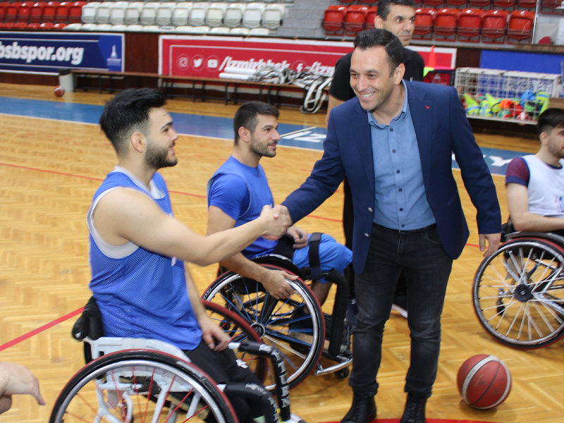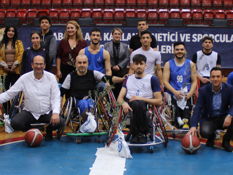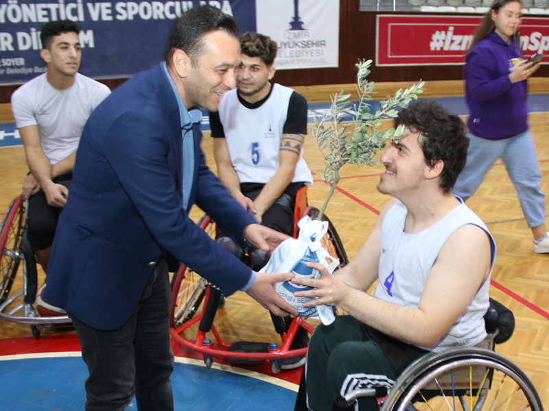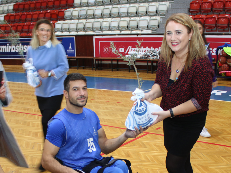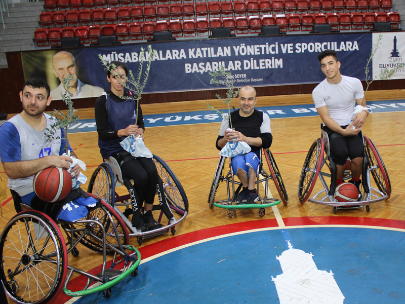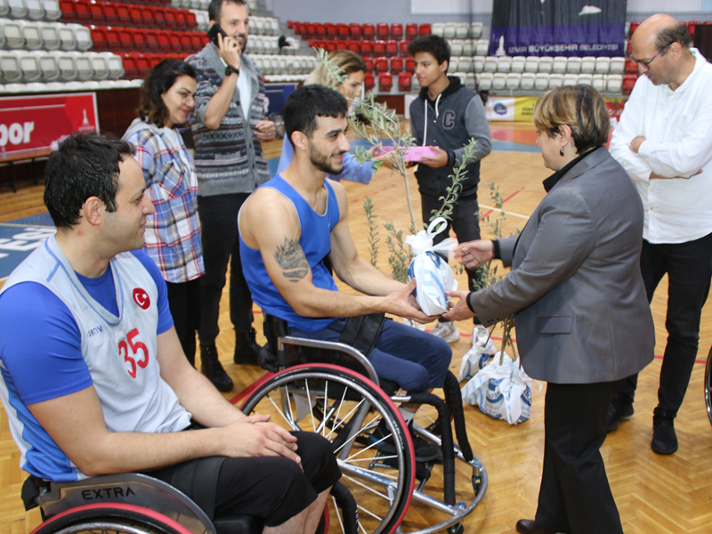 İZMİR Büyükşehir Belediyesi Basın Yayın ve Halkla İlişkiler Dairesi Başkanı İlker Kozan ve Halkla İlişkiler Şube Müdürü Elif Özkan ile İzmir Büyükşehir Belediyesi Gençlik ve Spor Kulübü Başkanı Ersan Odaman, özel etkinlikte İzmir Büyükşehir Belediyesi Gençlik ve Spor Kulübü Tekerlekli Sandalye Basketbol Takımı oyuncuları ile buluştu. Celal Atik Spor Salonu’ndaki organizasyonda tekerlekli sandalye basketbol takımı oyuncularımıza zeytin ağacı fidanı hediye edildi. Süper Lig mücadelesinde başarılar dilenen sporcular, Kozan ve Özkan’ı İzmir’deki maçlarda tribünde görmek istediklerini dile getirdi. Tekerlekli sandalye basketbolun kulübün en başarılı branşlarından biri olduğunu belirten Başkanımız Odaman, “İki yıl once Süper Lig’de Türkiye şampiyonu olduk. Hem belediye hem de kulüp olarak engelli branşlara sürekli yaptırım yapıyoruz. Böyle anlamlı bir günde yine birlikte olduğumuz için mutluyuz. Sizin başarılarınızla gurur duyuyoruz. Mart ayında Tekerlekli Sandalye Basketbol Avrupa Kupası dörtlü final maçları İzmir’de oynanacak. Bizimle birlikte Fenerbahçe, Fransa’dan iki, Polonya’dan bir takım İzmir’de buluşacak. Büyük bir heyecan bizi bekliyor. İzmirli sporseverleri Celal Atik Spor Salonu’na bekliyoruz” dedi.