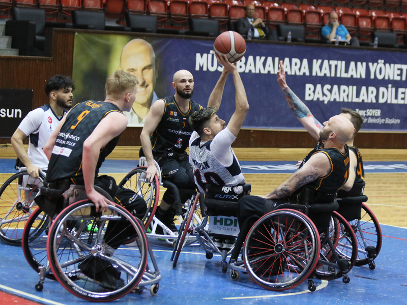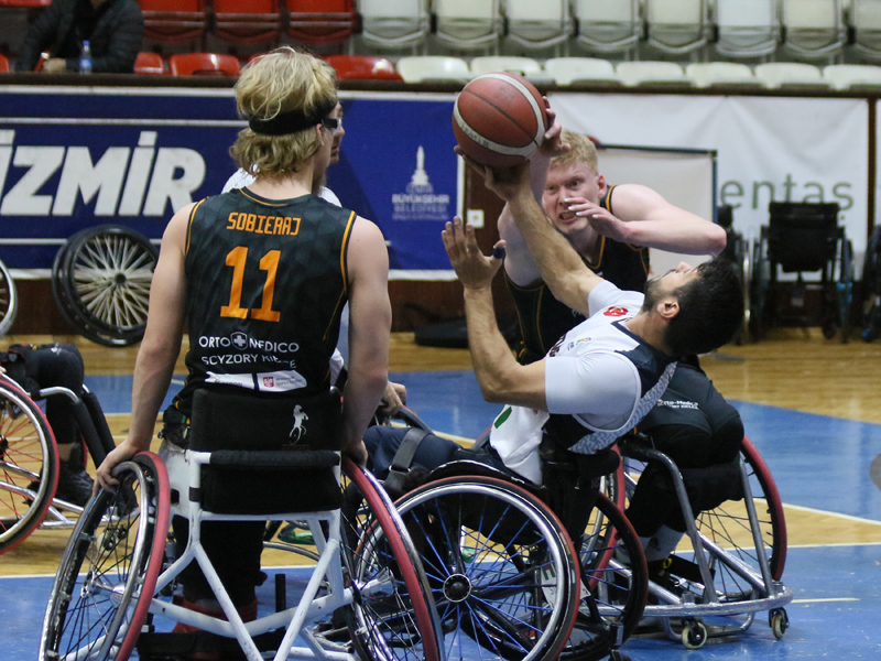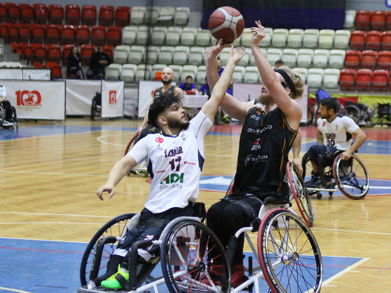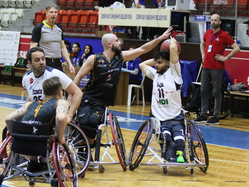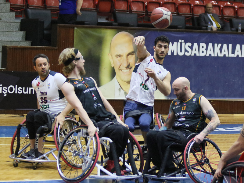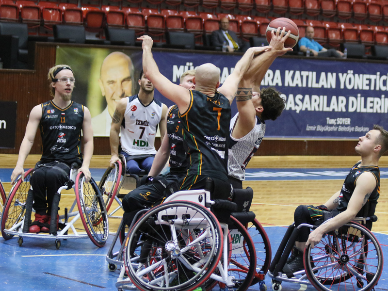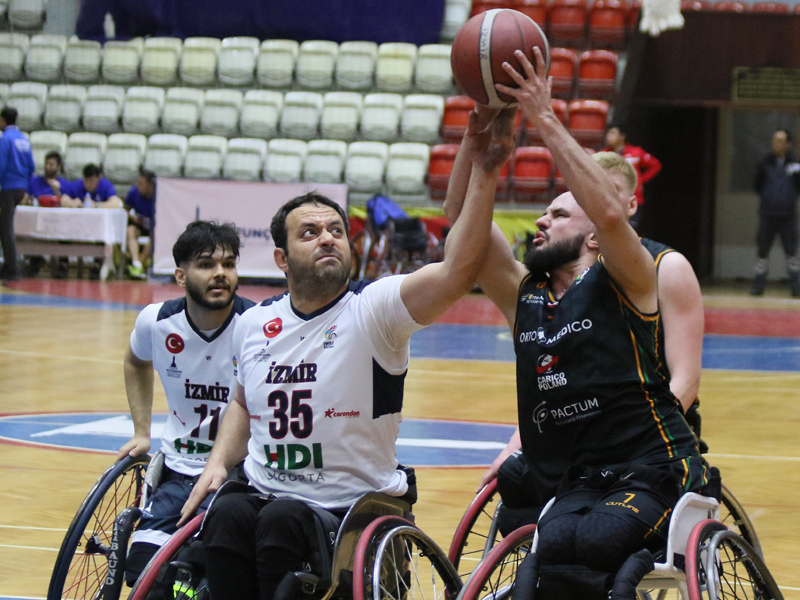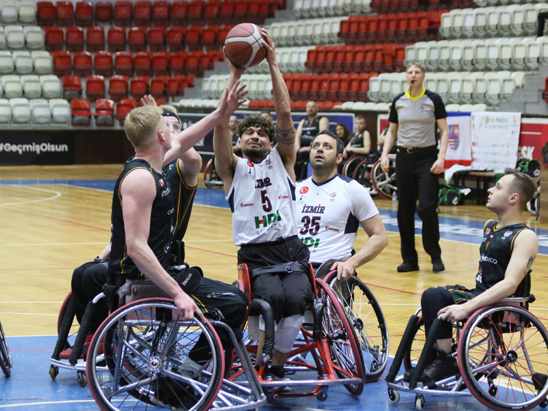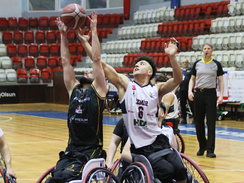 İzmir’de bugün sona erecek olan IWBF (Uluslararası Tekerlekli Sandalye Basketbol Federasyonu) Euro Cup 2 mücadelesinde İzmir Büyükşehir Belediyesi Gençlik ve Spor Kulübü, Orto-Medico Scyzory Kielce’yi 60-35 yendi ve 3 maçta 2 galibiyet alarak grup sıralamasında ikinci oldu. İzmir Büyükşehir Belediyesi Gençlik ve Spor Kulübü ile Fenerbahçe Göksel Çelik, bugün saat 18.00’de Celal Atik Spor Salonu’nda final maçında karşı karşıya gelecek. Kazanan takım, İspanya’daki Eurocup finallerine, kaybeden takım da Yalova’daki Eurocup 3 final grubu maçlarına 27-30 Nisan’da katılacak. Polonya temsilcisi karşısında baştan sona üstün bir oyun sergileyen İzmir Büyükşehir Belediyesi Gençlik ve Spor Kulübü, ilk periyotu 11-4, devreyi de 25-15 önde kapattı. Son periyoda 36-27 önde başlayan İzmir temsilcisi, karşılaşmadan da 60-35’lik skorla galibiyetle ayrılmayı bildi.