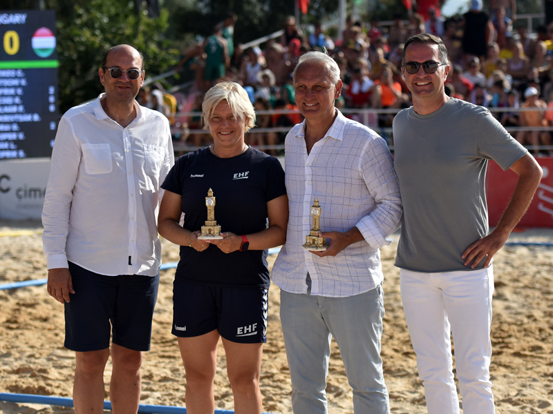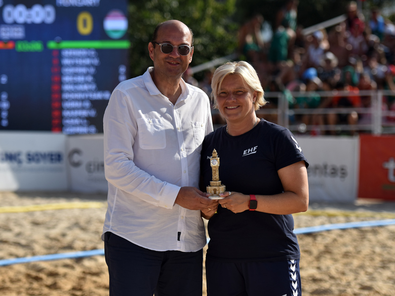 Final maçları öncesi İzmir Büyükşehir Belediyesi Gençlik ve Spor Hizmetleri Dairesi Başkanı Hakan Orhunbilge ve İzmir Büyükşehir Belediyesi Gençlik ve Spor Kulübü Başkanı Ersan Odaman, EHF Plaj Hentbolu Sorumlu Yönetim Kurulu Üyesi Gabriella Horváth ve Türkiye Hentbol Federasyonu Başkanı Uğur Kılıç'a şampiyona anısına İzmir Saat Kulesi biblosu hediye etti.