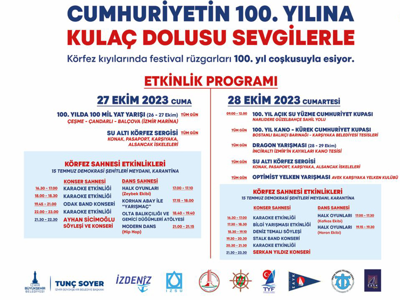 İZMİR Büyükşehir Belediyesi’nin bu yıl 6’ncısını düzenleyeceği İzmir Körfez Festivali ile Cumhuriyet’in 100. yılında yelkenler Cumhuriyet’e açılacak. İzmir Körfezi 27-29 Ekim tarihleri arasında üç gün boyunca optimist, laser, kano, dragon yarışları, yat yarışları ve yüzme etkinlikleri ile açık su yüzme yarışlarına sahne olacak.