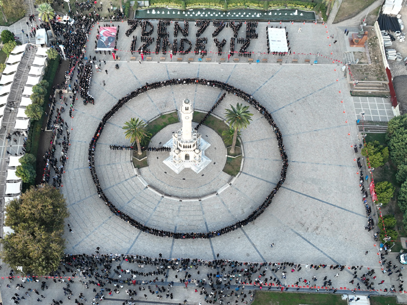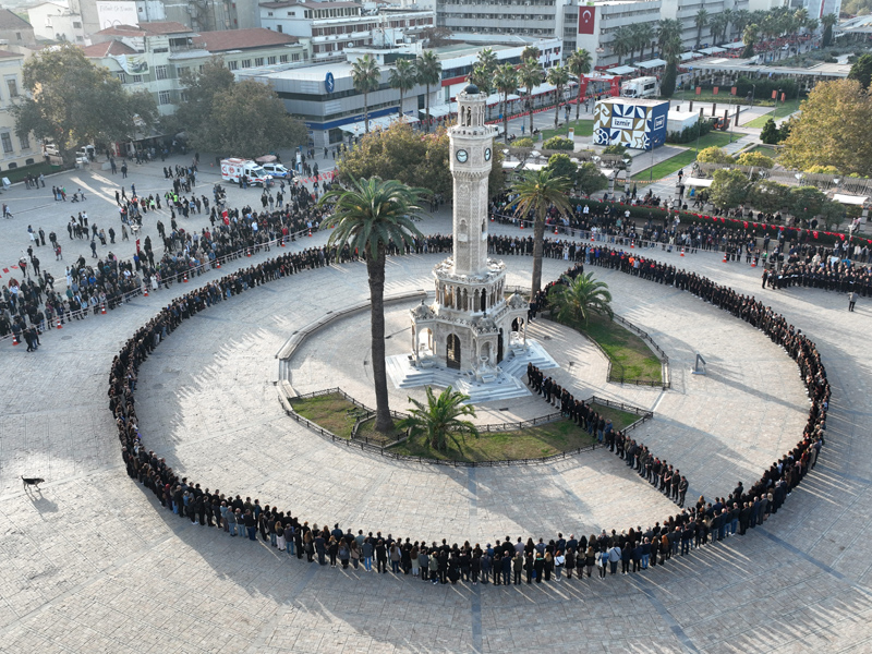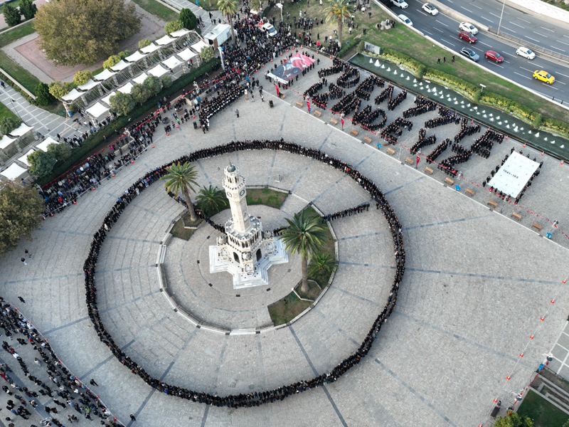 İZMİR Büyükşehir Belediyesi, ulu önder Mustafa Kemal Atatürk’ün ölümünün 85’inci yıldönümünde saatler 9.05’i gösterirken belediye çalışanlarının yer aldığı etkileyici bir görsel etkinliğe imza attı. Konak Atatürk Meydanı’nda 1881 kişi “7’den 77’ye İzindeyiz” yazısı ve 9’u 5 geçe duran saat figürü oluşturuldu.