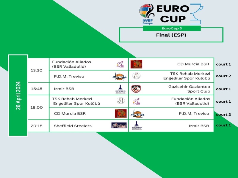İzmir Büyükşehir Belediyesi Spor Kulübü tekerlekli sandalye basketbol takımımızın finallere katılmaya hak kazandığı EuroCup3 26-28 Nisan tarihleri arasında İspanya'da başlıyor.