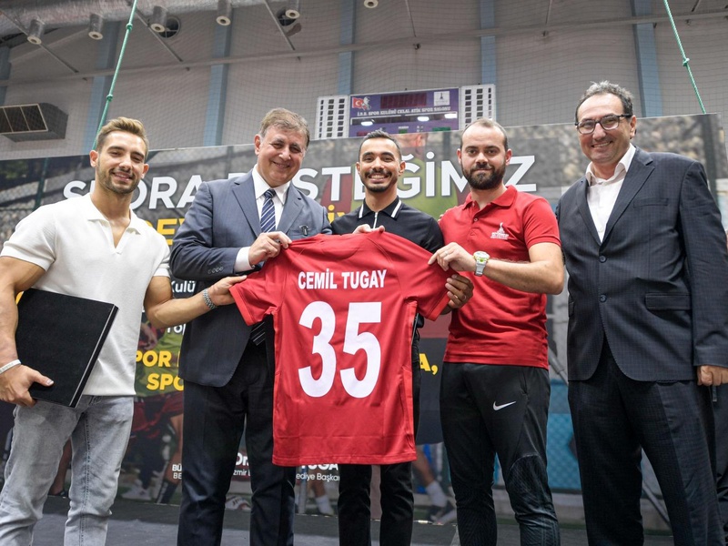 Törende İzmir Amatör Spor Kulüpleri Federasyonu Başkanı Efkan Muhtar, Başkan Tugay’a sporun gelişimine gösterdiği katkıdan dolayı plaket verirken milli sporcular ise Cemil Tugay yazılı 35 numaralı ay yıldızlı milli formayı hediye etti. Törene katılan sporcularla hatıra fotoğrafı çektiren Başkan Tugay, minik sporcuların formalarını imzaladı.