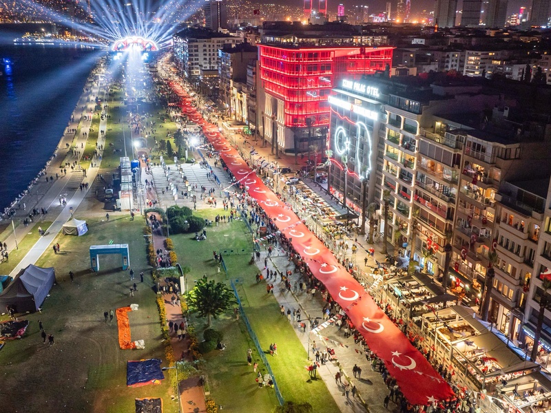 Saat Kulesi önünden başlayan kortej, Konak Pier önünde 350 metrelik Türk bayrağı ve fener alayı ile birleşti. İzmir Büyükşehir Belediye Bandosu'nun marşları eşliğinde kortej 1. Kordon’a doğru ilerledi. Körfezdeki gemiler ise korteje sirenlerle eşlik etti. Cumhuriyet Meydanı’nda havai fişek gösterisi ile coşku doruğa ulaştı. Havai fişek gösterisinin ardından fener alayı Gündoğdu Meydanı’na ilerledi.