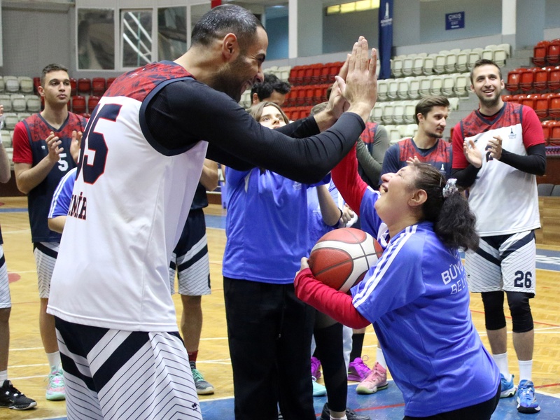 Türkiye Bölgesel Basketbol Ligi’nde bayrama lider giren İzmir Büyükşehir Belediyesi Erkek Basketbol Takımı oyuncuları Celal Atik Spor Salonu’ndaki antrenman öncesinde özel gereksinimli gençlerle hem basketbol oynadı hem de Ramazan Bayramı coşkusunu paylaştı. Koç Okan İnce, kaptan Hüseyin Emir Nuriler ve spor okulları altyapısından yetişerek A takıma yükselen Hasan Özaytabak birlikte antrenman yaptıkları genç sporcuları ve ailelerini 5 Nisan Cumartesi günü oynayacakları Çiftlikköy Belediyesi maçına davet etti.
