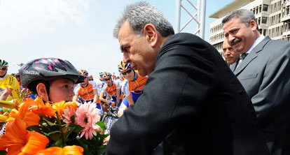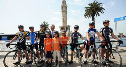 Start öncesi Saliha Hüseyin Özyavuz İlköğretim Okulu Bisiklet Kulübü öğrencileri, kendilerine 8 adet yol yarış bisikleti armağan eden İzmir Büyükşehir Belediye Başkanımız Aziz Kocaoğlu’na bisiklet sporuna sağladığı destek nedeniyle çiçek vererek teşekkür etti.