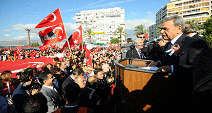 İzmir Büyükşehir Belediyesi tarafından dağıtılan üzerinde Atatürk resmi bulunan önlükler ve Türk bayrakları ile birlikte Alsancak İskelesi’nden Cumhuriyet Meydanı’na yürüyen vatandaşlar, marşlar söyleyerek meydana ulaştı. Meydanda konuşma yapan İzmir Büyükşehir Belediye Başkanı Aziz Kocaoğlu, “Mustafa Kemal Atatürk, savaş ustalığını diplomasiyle yoğurup, emperyalizme diz çöktüren, bu açıdan tüm ezilen halklara ve ülkelere örnek oluşturan, evrensel bir kahramandır” diye konuştu.