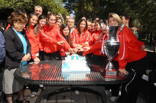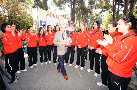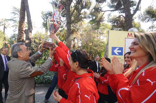 Türkiye şampiyonu olan İzmir Büyükşehir Belediyesi Bayan Hentbol Takımı, şampiyonluk kupasını Büyükşehir Belediye Başkanı Aziz Kocaoğlu’na getirdi.