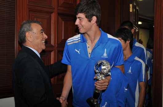 Şampiyon gençlerin Başkan Aziz Kocaoğlu’nu ziyaretinde, İzmir Büyükşehir Belediyesi Genel Sekreter yardımcıları Serpil Baran ve Erhan Bey ile Gençlik ve Spor Kulübü Genel Sekreteri Kemal Bulut da hazır bulundu.