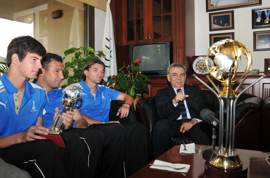 “Mini Dünya Kupası” niteliğindeki One Nation Cup Turnuvası’nda Güney Afrika, Bosna Hersek, Polonya, Almanya ve Yeni Zelanda’yı farklı skorlarla yenerek şampiyon olan İzmir Büyükşehir Belediyesi karması, kupayı Başkan Aziz Kocaoğlu’na hediye etti.