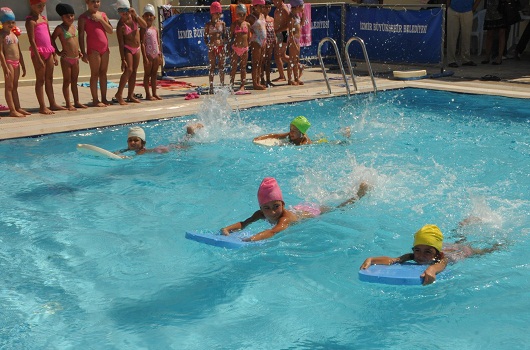 İzmir Büyükşehir Belediyesi Yaz Spor okulları kapsamında yüzme kurslarına devam eden öğrenciler, düzenlenen Yüzme Şenliği ile sezonun kapanışını yaptı. Kurslarda aldıkları eğitimi ailelerinin önünde sergileyen minikler, kendi yaş grupları arasındaki yarışmalarda dereceye girebilmek için mücadele etti. Gruplarında ilk dörde girenler madalya ile ödüllendirildi. Havuzda yarışan minikler kadar onları izleyen anne babaları da büyük heyecan yaşadı.