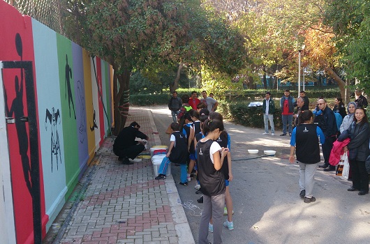 Bu arada İzmir Büyükşehir Belediyespor Kulübü sporcuları, İzmir Enternasyonel Fuarı'nda yer alan spor kulübü binasında bir araya gelerek duvarı boyadı. Basketbol futbol masa tenisi hentbol başta olmak üzere etkinliğe bir çok branştan katılan 100'e yakın minik sporcular renkli görüntüler oluşturdu.