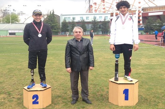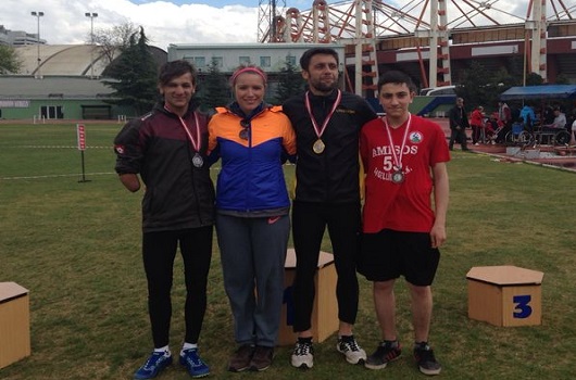 BEDENSEL Engelli Takımımız, Türkiye Atletizm Şampiyonası'nda 4 altın 1 de gümüş madalya kazandı.12-14 NİSAN tarihleri arasında Ankara'da düzenlenen Bedensel Engelli Türkiye Atletizm Şampiyonası'nda mücadele eden takımımız, 4 altın 1 gümüş madalya alarak şampiyonaya damgasını vurdu. 16 yaş altı kategorisinde Kerim Elyaz üç adım atlamada 11.78'lik derecesiyle altın madalya kazanırken Avrupa barajını da aşmış oldu. Başarılı sporcu 100 metrede de altın madalyayı boynuna geçirdi. 200 metrede mücadele eden Nurullah Kart birincilik kürsüsüne çıkarken, 100 metre yarışlarında gümüş madalya kazandı. 1500 metrede yarışan Cahit Kılıçarslan ise biriciliği kimseye bırakmayarak şampiyonayı altın madalya ile tamamladı.