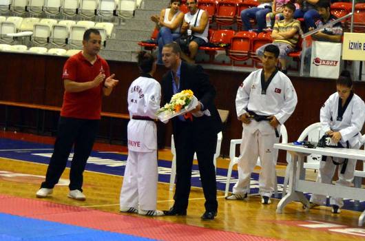 kazanan sporcumuz İrem Bekdaş'ı tebrik ederek çiçek takdim etti.