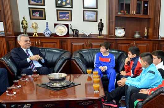 sporcu ve antrenörlerini makamında kabul ederek başarı diledi.